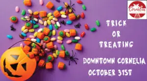 Cornelia- Trick or Treating Enjoy an Afternoon/Evening visiting the local business’ in downtown to get candy. + Add to Google Calendar + iCal / Outlook export Date Oct 31 2023 Expired! Time 3:00 pm - 6:00 pm Location 101 N. Main Street Cornelia GA Category Events